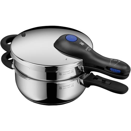 La chiave per cucinare in casa in modo facile e veloce: Il set di pentole a pressione Perfect Plus One Pot di WMF offre pasti perfetti in pochissimo tempo, per una cucina deliziosa e sana, ricca di sapore. Questa pentola a pressione salva tempo offre risultati impeccabili con tempi di cottura fino al 70% più rapidi rispetto ai metodi convenzionali* e conserva una quantità di vitamina C fino a 1,7 volte superiore.* Scoprite una pentola 3 in 1, che funge da pentola classica, vaporiera e pentola a pressione in un'unica soluzione, creata per fare tutto, dall'irresistibile chili con carne al risotto cremoso, alle costolette brasate alla birra, al pollo tikka masala, ai dolci e molto altro. Questa pentola versatile semplifica la cottura in casa, grazie a un coperchio intuitivo con evidenziazioni blu che ne facilitano l'uso. Il sistema di sicurezza a sette livelli e il rilascio extra delicato del vapore offrono una comodità e una sicurezza totali. Realizzata in Cromargan®, lavabile in lavastoviglie e compatibile con tutti i piani cottura, la pentola Perfect Plus One garantisce una distribuzione ottimale del calore per risultati impeccabili.